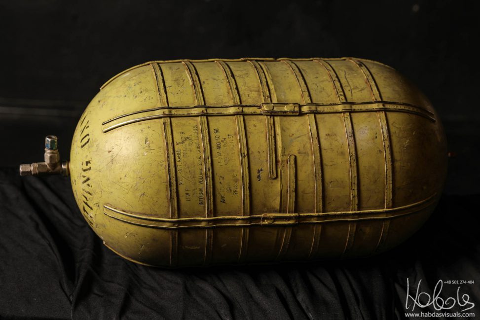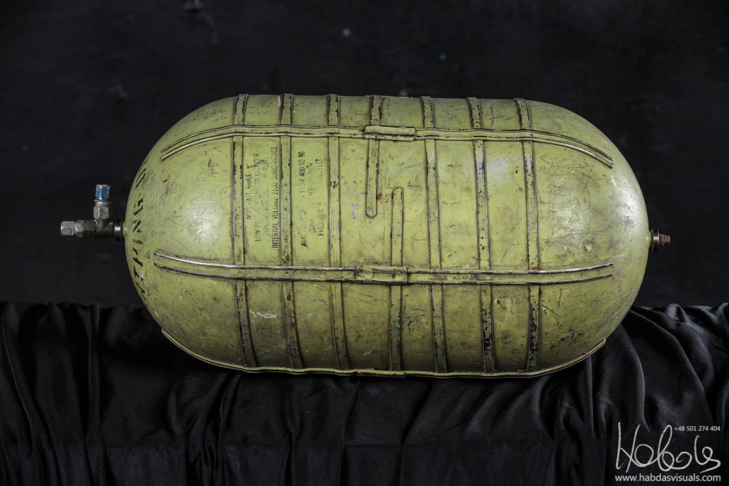 Zbiornik tlenu do samolotu B17 B24 B25 (WW2). Wymiary 72cm x 30cm. Jeden z ciekawszych eksponatów, pochodzący z samolotu z II Wojny Światowej. Zakupiony na lokalnej giełdzie „samochodowej” w Miedzianej Górze. Butla zapewne pochodzi z samolotu, który w czasach II Wojny Światowej latał nad Polską, został zestrzelony, lub lądował awaryjnie na terenie naszego kraju. Nie udało mi się jeszcze ustalić, z którego konkretnie samolotu pochodzi.