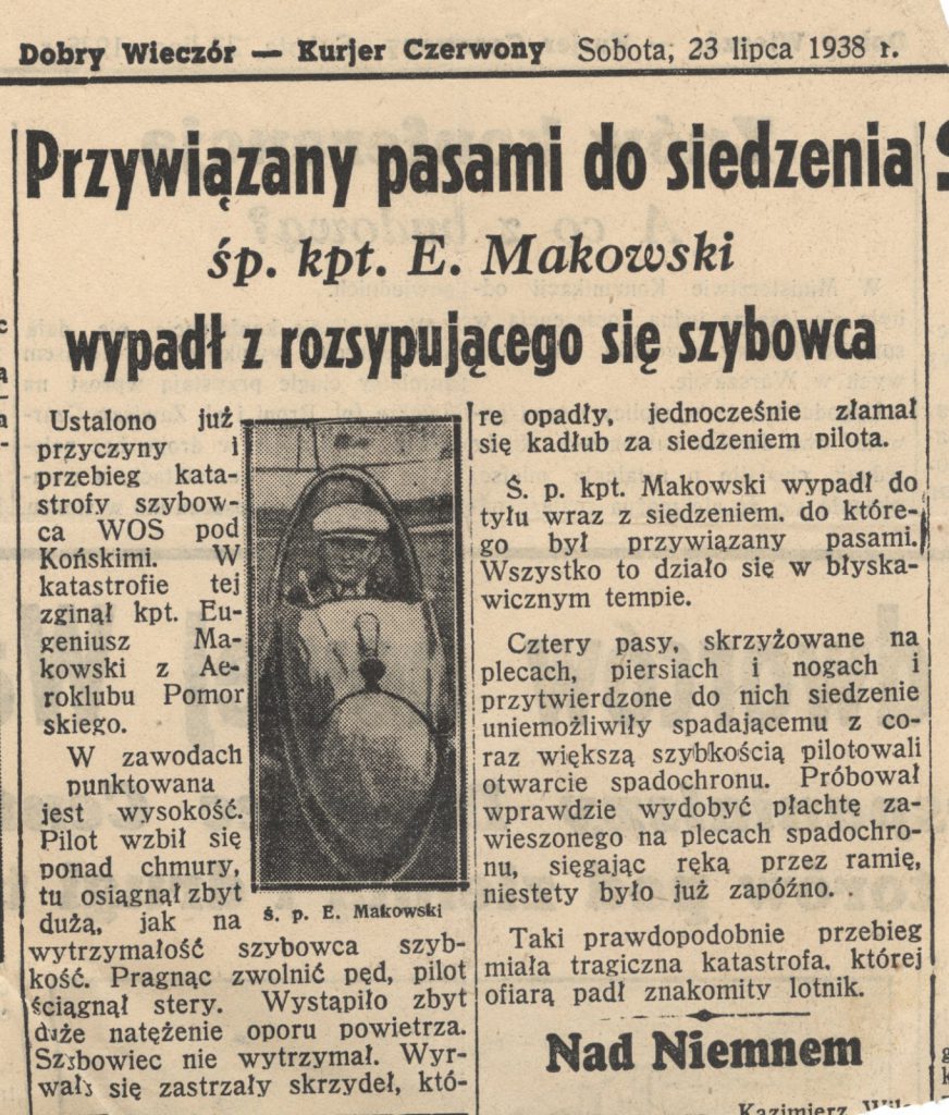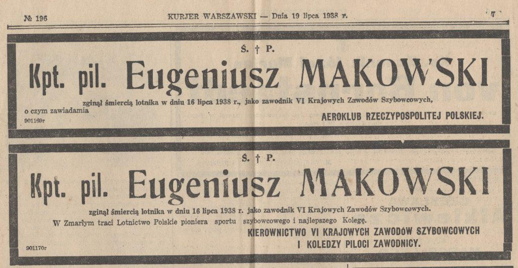 Kpt pil. Michał Eugeniusz Makowski z Eskadry Szkolnej 4.PL (Toruń, gdzie tworzył i dowodził eskadrą myśliwską). Jego pasją było szybownictwo, należał do niego rekord Polski w wysokości lotu szybowcem. Zginął o godz. 12.04 dnia 16.07.1938 r. gdy starował na szybowcu „Orlik I” podczas VI Krajowych Zawodów Szybowcowych odbywających się w Masłowie (starty).
