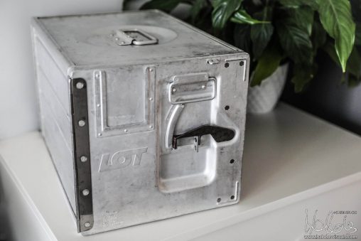 Aluminiowa skrzynka – lotniczy BOX cateringowy PLL LOT (galley box/ catering container). Wymiary skrzynki to 29cm szerokość x 28cm wysokość x 41 głębokość #64