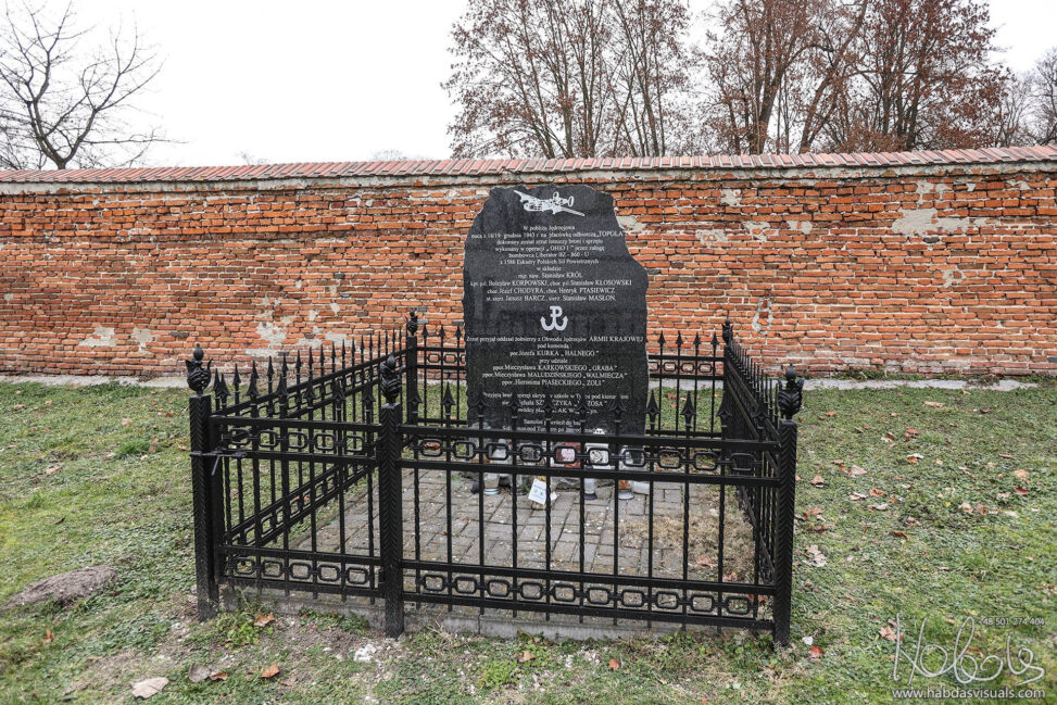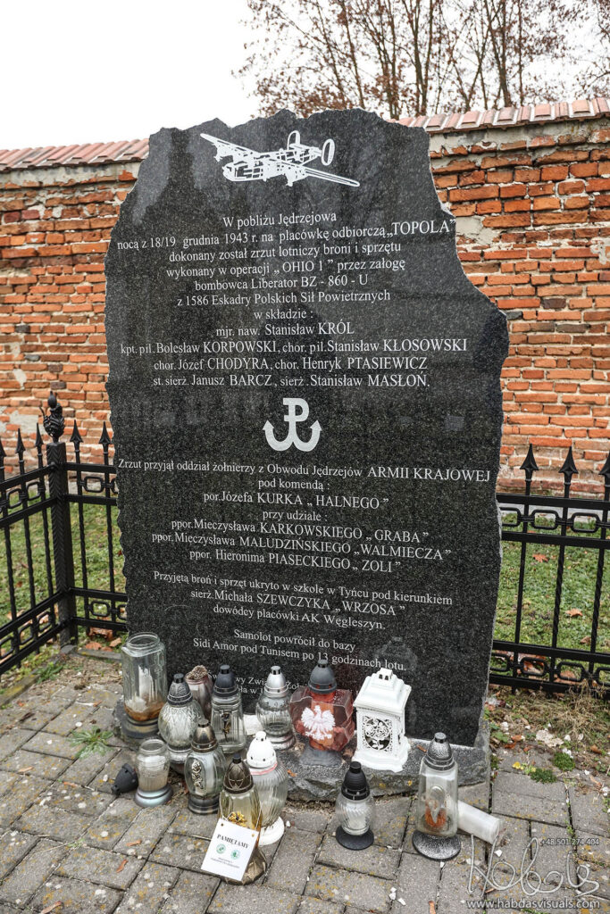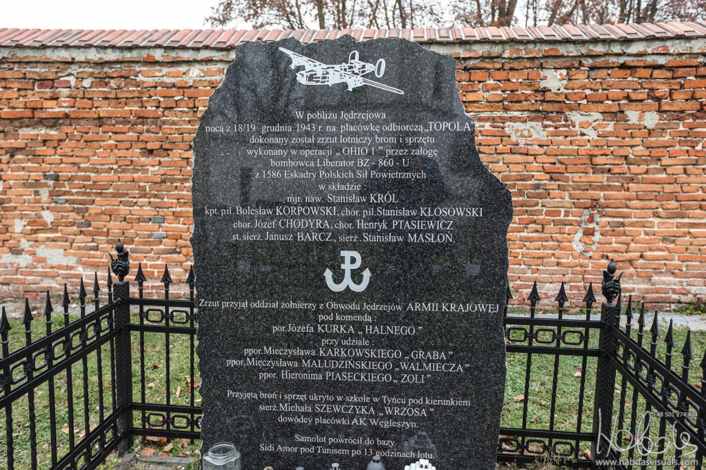 Napis na tablicy: „W pobliżu Jędrzejowa nocą z 18/19 grudnia 1943r. na placówkę odbiorczą „TOPOLA” dokonany został zrzut lotniczy broni i sprzętu wykonany w operacji „OHIO1” przez załogę bombowca Liberator BZ-860-U z 1586 Eskadry Polskich Sił Powietrznych w składzie mjr. naw. Stanisław Król, kpt. pil. Bolesław Korpowski, chor. pil. Stanisław Kłosowski (więcej informacji LINK1, LINK2), chor. Józef Chodyra, chor. Henryk Ptasiewicz, st. sierż. Janusz Barcz, sierż. Stanisław Masłoń. Zrzut przyjął oddział żołnierzy z Obwodu Jędrzejów Armii Krajowej pod komendą pr. Józefa Kurka „Halnego” przy udziale ppor. Mieczysława Karkowskiego „GRABA”, ppor Mieczysława Maludzińskiego „Walmiecza”, ppor. Hieronima Piaseckiego „ZOLI”. Przyjętą broń i sprzęt ukryto w szkole w Tyńcu pod kierunkiem sierż. Michała Szewczyka „WRZOSA” dowódcy placówki AK Węgleszyn. Samolot powrócił do bazy Sidi Amor pod Tunisem po 13 godzinach lotu.