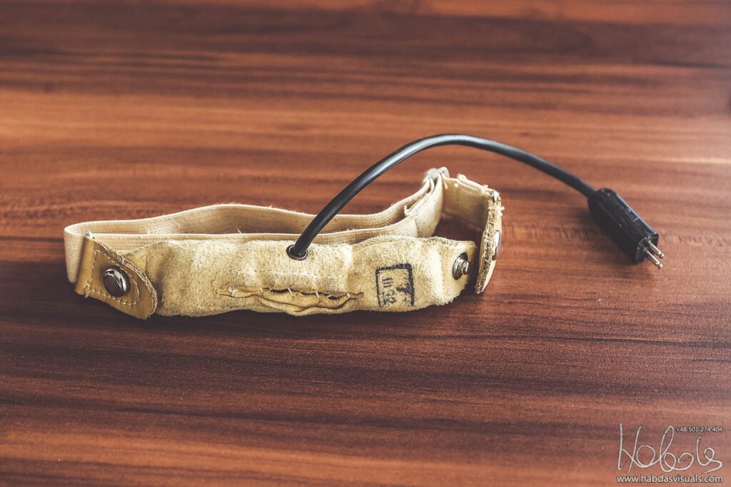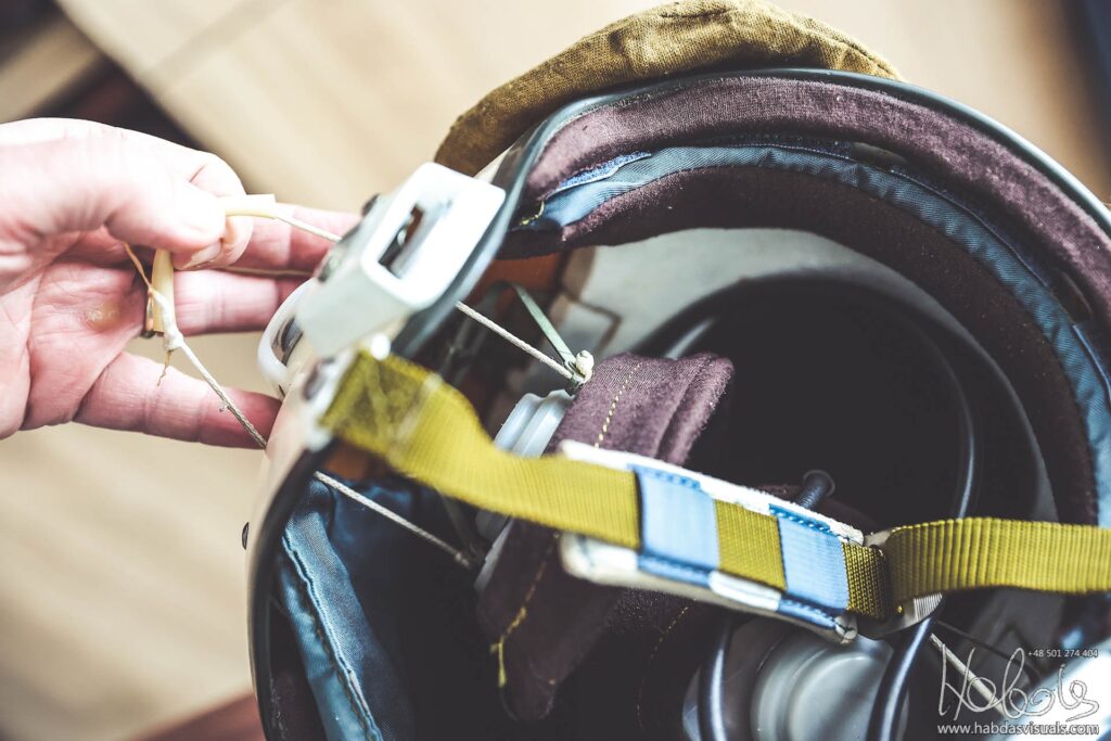 Wewnątrz hełmu znajdziemy jeszcze słuchawki, na regulowanych pałąkach. Ponieważ są one na sprężynującym mocowaniu, by założyć hełm, odciągamy je sznureczkami z zewnątrz (nr 4 na rys.).