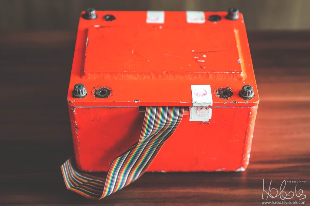 W środku znajduje się urządzenie, podobne do małego magnetofonu