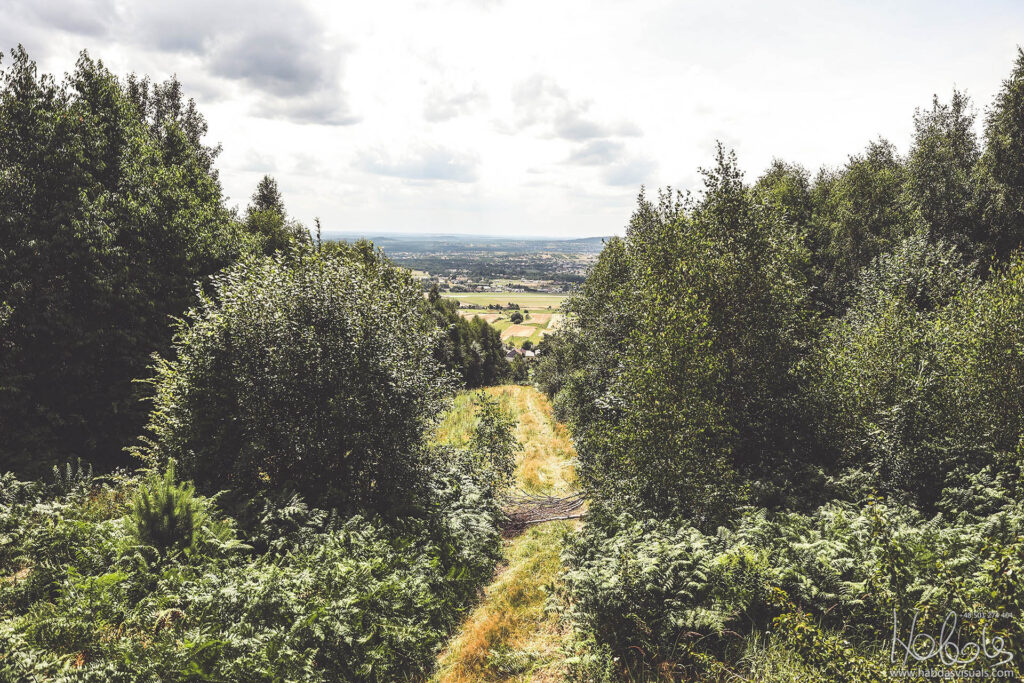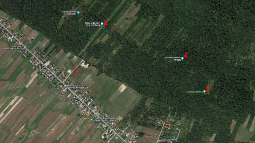 Wędrówkę rozpocząłem z parkingu (1) przy drodze prowadzącej do Góry Klonówki, na wysokości platformy widokowej (2) (skręt przy posesji Podklonówka 69 i przystanku autobusowym).