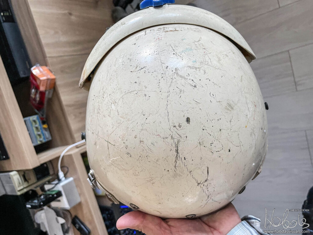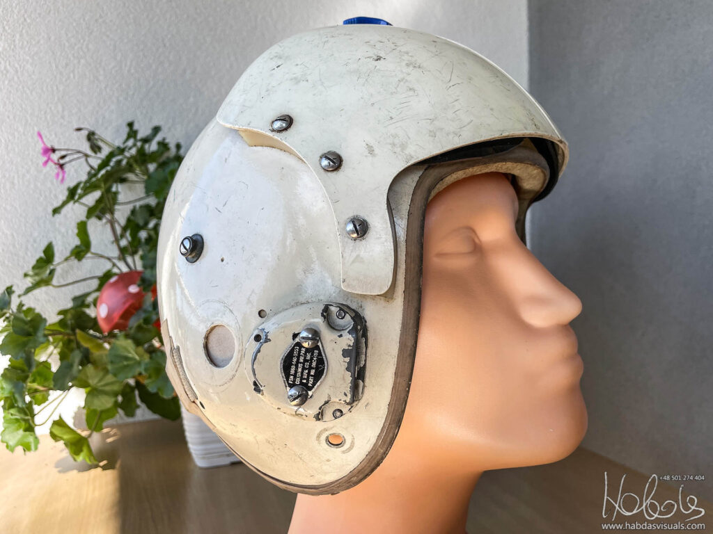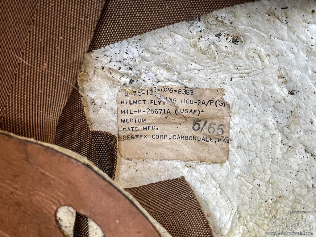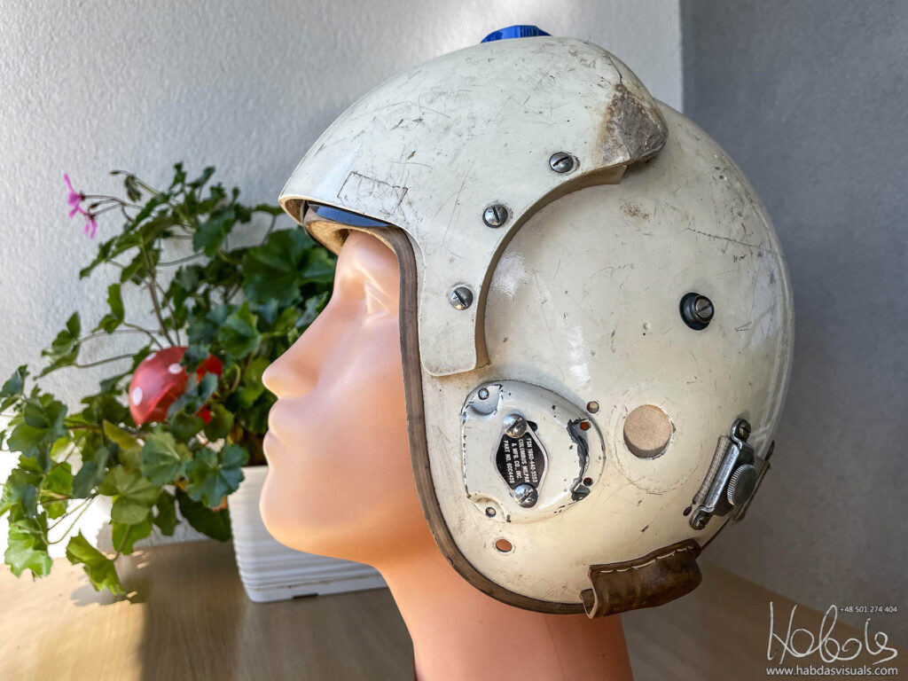 Mój hełm, jeśli wierzyć naklejce pochodzi z maja 1965 roku, ma więc 58 lat (post powstał w 2023 roku). Model MIL-H-26671A to wczesna wersja HGU-2A/P. Brakuje w nim słuchawek, części wypełnień, nie mam także maski. Nie mam też pewności, że wszystkie elementy są oryginalne od tego modelu.