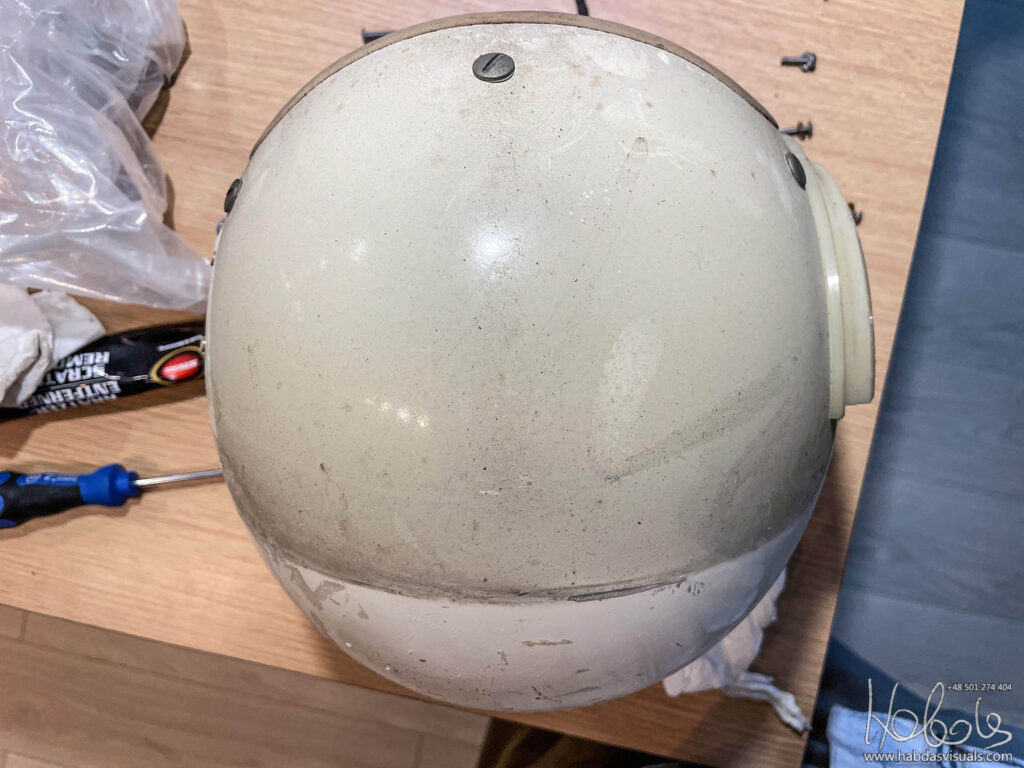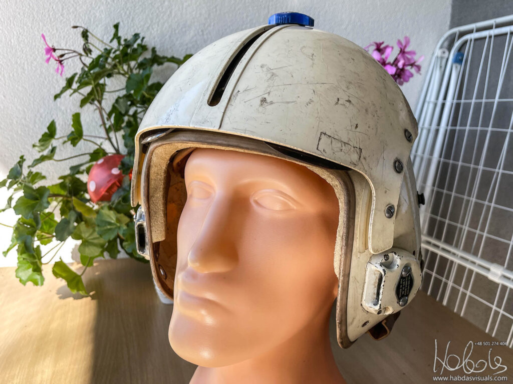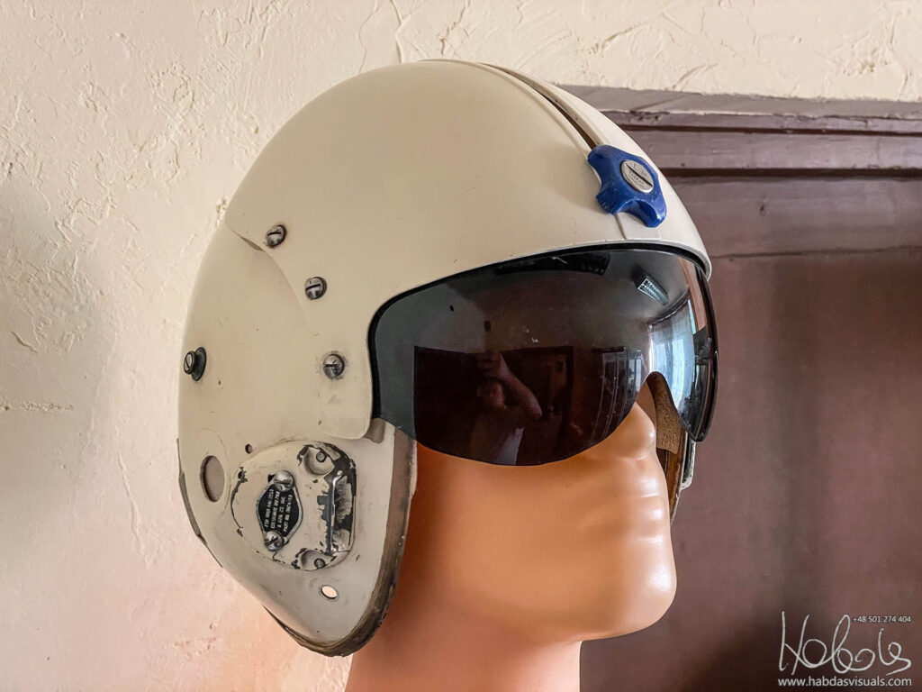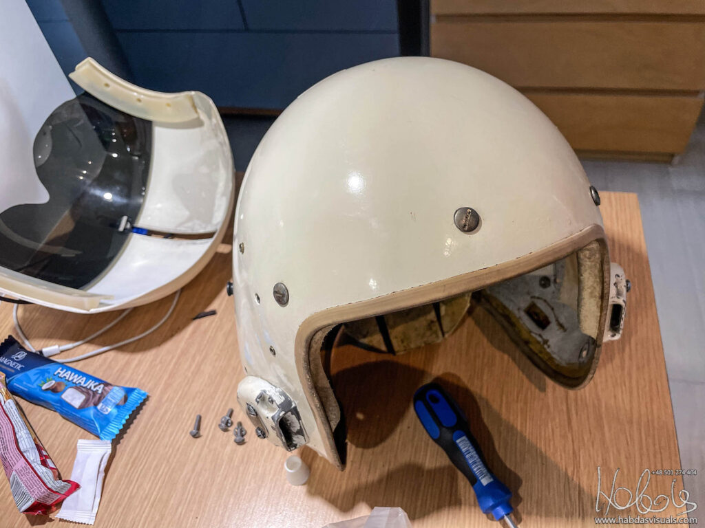 Mój hełm, jeśli wierzyć naklejce pochodzi z maja 1965 roku, ma więc 58 lat (post powstał w 2023 roku). Model MIL-H-26671A to wczesna wersja HGU-2A/P. Brakuje w nim słuchawek, części wypełnień, nie mam także maski. Nie mam też pewności, że wszystkie elementy są oryginalne od tego modelu.