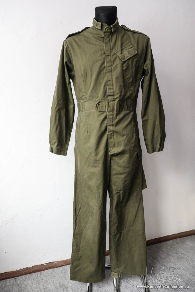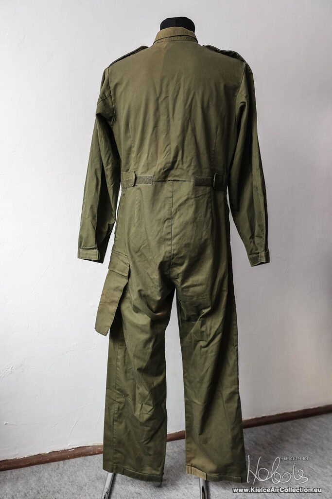 Kombinezon męski jednoczęściowy w kolorze oliwkowym, zapinany z przodu na solidny rzep. Ma mnóstwo miejsc, w których możemy regulować jego obwody. Możliwość regulacji za pomocą ściągaczy na rzepy u dołu rękawów oraz z tyłu w pasie. Kombinezon posiada jedną kieszeń po lewej stronie klatki piersiowej, dwie klasyczne w pasie i jedną głęboką na lewym kolanie. Wszystkie kieszenie zapinane są na rzepy, kombinezon nie posiada guzików. Naramienniki również zapinane są na rzepy.
