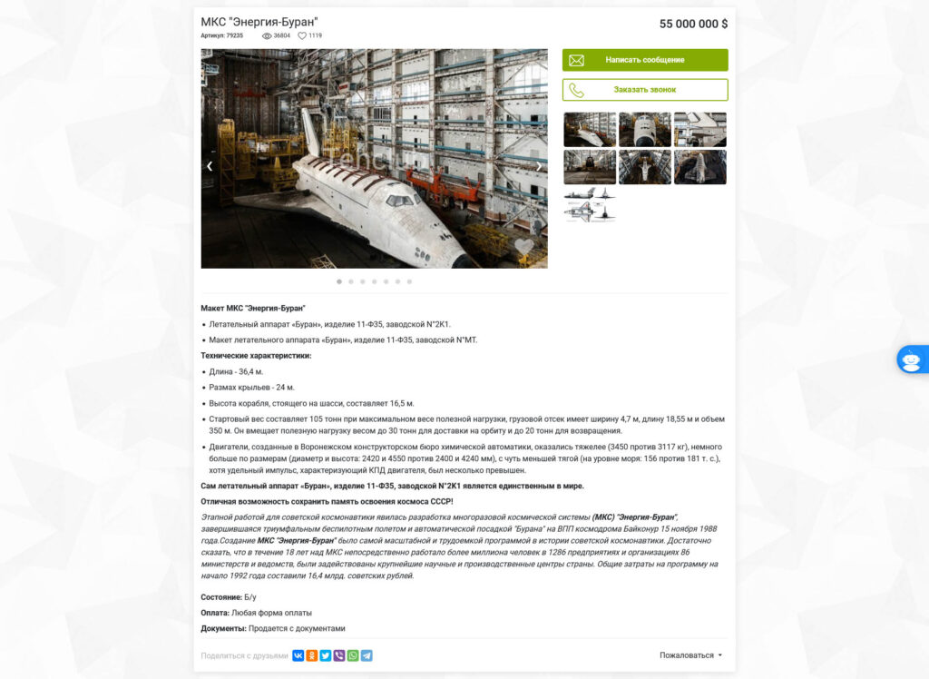Za jedyne 55 000 000 dolarów można stać się właścicielem promu kosmicznego Buran. Konstrukcji podobnej do promów kosmicznych budowanych w USA. (trzeba pamiętać, że rosjanie słynęli z produkcji „podobnych konstrukcji”… np. konstrukcja samolotu TU-144 przypomina Concorda, a aparaty fotograficzne Kiev 66 są bardzo podobne do konstrukcji Hasselblada, przykłady można by mnożyć). Jest wiele opinii, że rosyjscy szpiedzy dotarli do niektórych planów Space Shuttle. Konstrukcje te pomimo podobieństwa zewnętrznego, zawierają wiele istotnych różnic konstrukcyjnych.