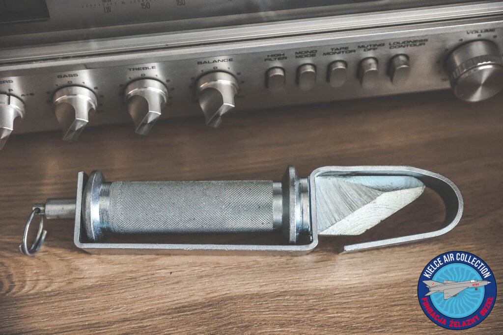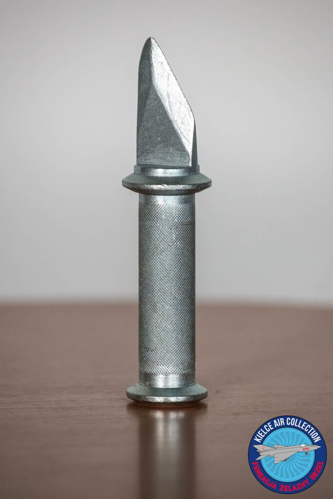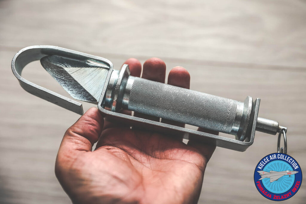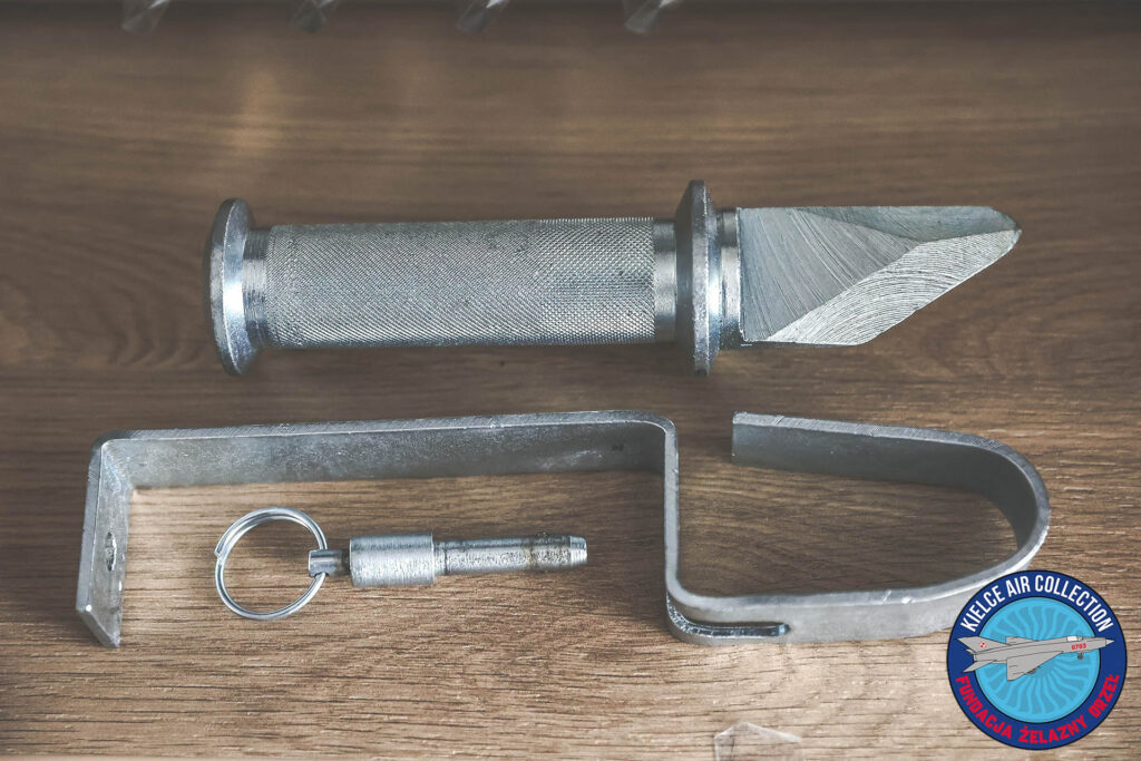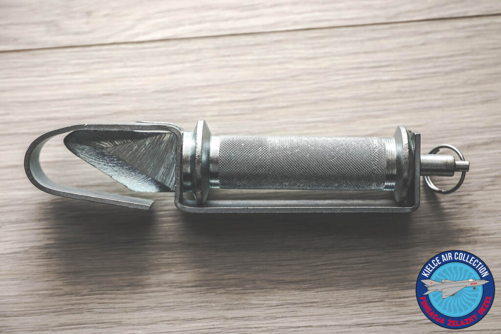 Nóż – młotek ratunkowy, dosyć ciężki, i w sumie nie ostry. Może służyć bardziej jako łom, lub wspomniany młotek. Podejrzewam że używany w niektórych wersjach MiG-21 / MiG-23 i na pewno w śmigłowcu Mi-24, choć na fb rozgorzała dyskusja, i wiele osób nie kojarzy tego elementu z kabiny MiG-ów. Jeśli ktoś ma więcej informacji proszę o kontakt habdasw@o2.pl.