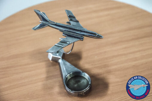 Pamiątkowa figurka, statuetka (i popielniczka w jednym) z sylwetką samolotu. Podejrzewam, że wykonana rzemieślniczo. Pamiątka była prezentem dla Tow. T. Wachowskiego od Aktywu Pionu TM, Kraków dn. 18.X.68…