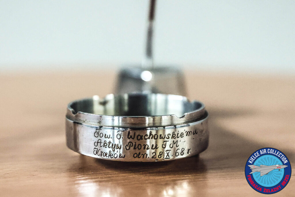 Pamiątka była prezentem dla Tow. T. Wachowskiego od Aktywu Pionu TM, Kraków dn. 18.X.68 r. o czym świadczy inskrypcja na podstawie.