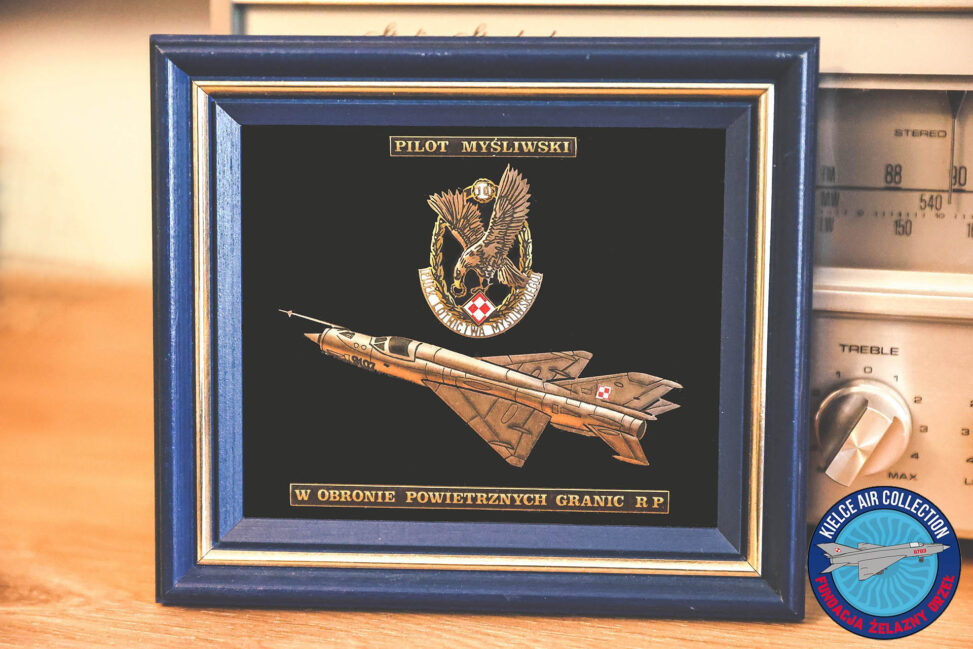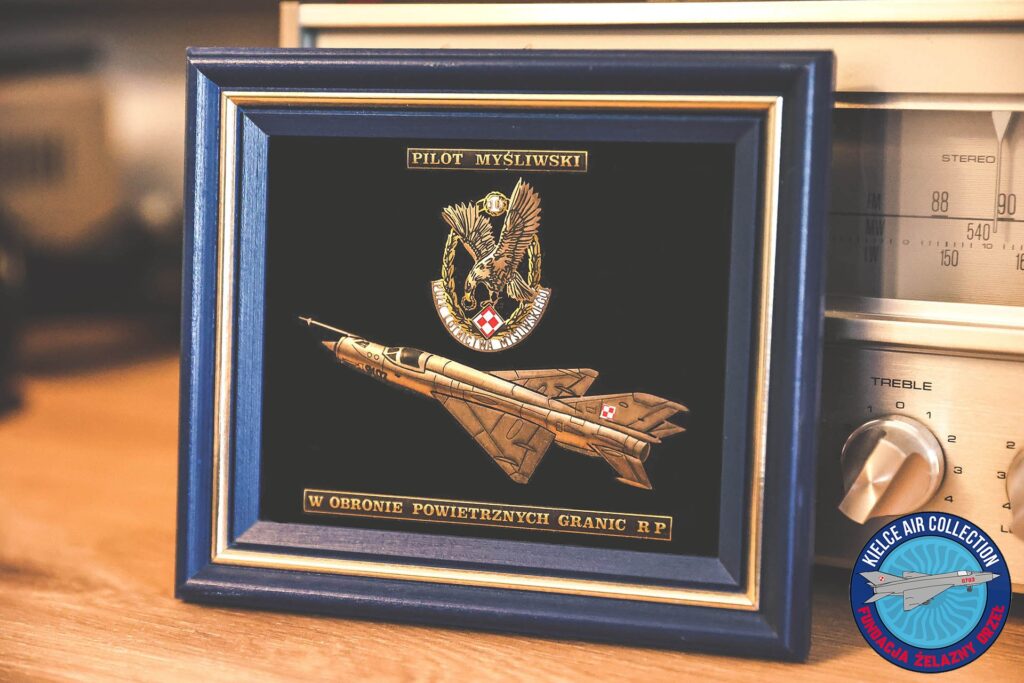 Plakietka pamiątkowa Pilot Myśliwski – W Obronie Powietrznych Granic RP. Na plakietce znajduje się symbol 10 Pułku Lotnictwa Myśliwskiego w Łasku. (1944r.-1946r. 1968r.-1999r.), oraz sylwetka samolotu MiG-21.