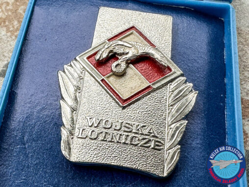 Odznaka Pamiątkowa Wojsk Lotniczych 1974. Prostokątna tarcza, na niej szachownica lotnicza i gapa pilota, po bokach liście laurowe, odznaka mocowana na słupek nakrętką, tombak srebrzony, emalia, 31.4 x…