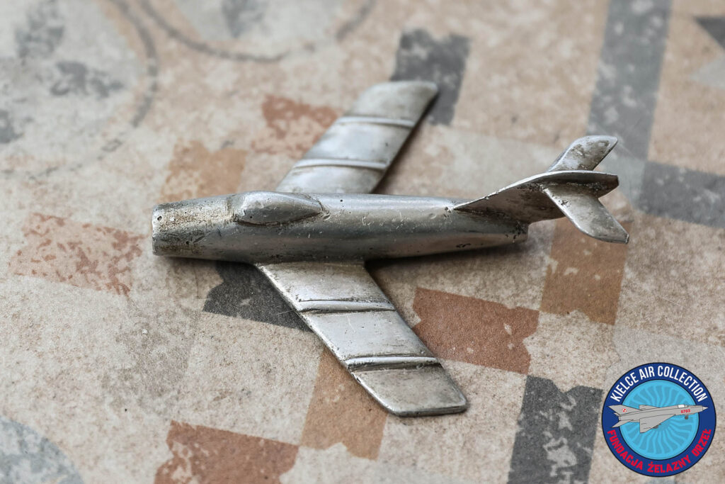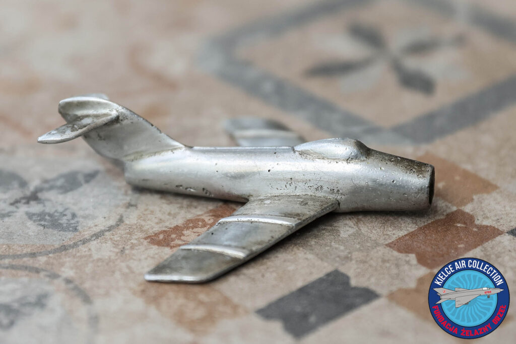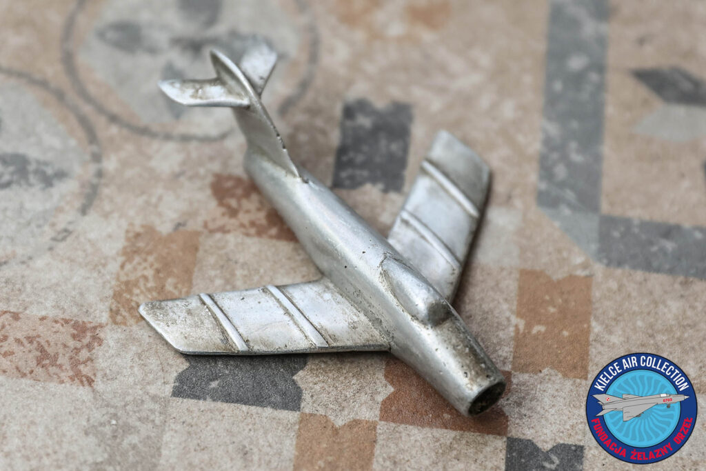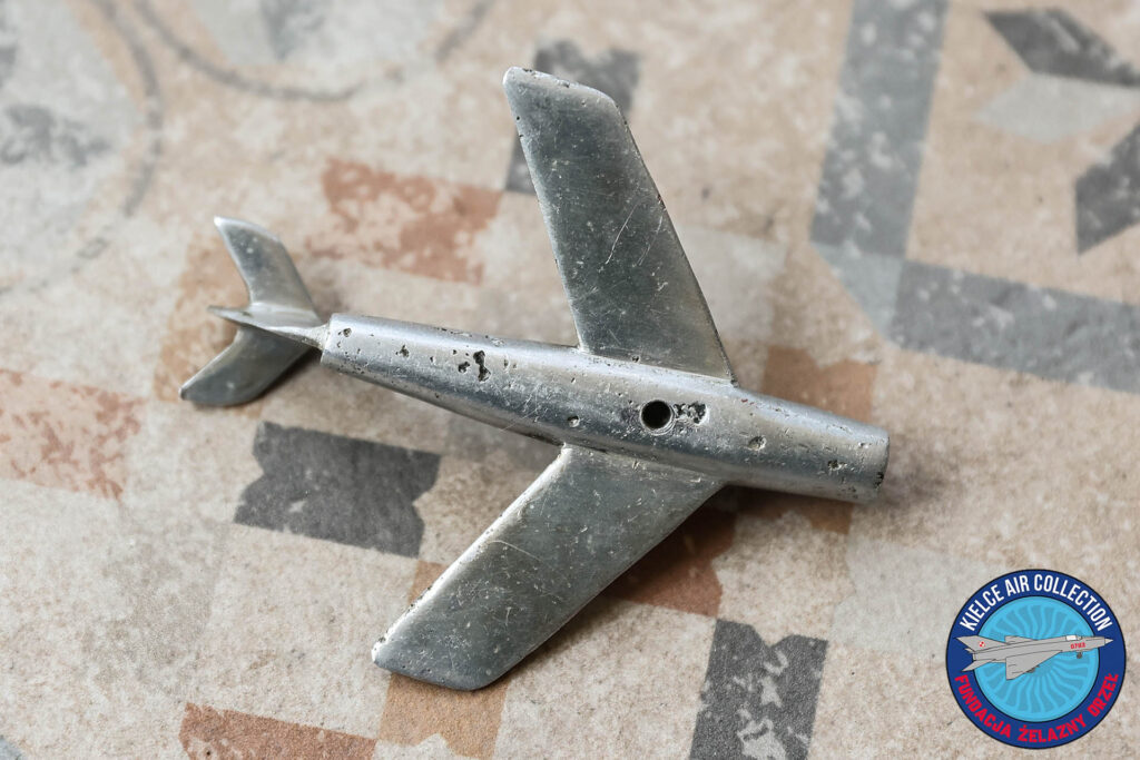 Na czerwcowej (2025 r.) Giełdzie Kolekcjonerskiej przy kieleckim Wojewódzkim Domu Kultury udało mi się zakupić aluminiowy model samolotu rodziny MiG/Lim. Cały samolocik jest dosyć wiernie odwzorowany, ma 9 cm długości, a gwintowany otworek na dole sugeruje, że mógł być ozdobą jakiejś popielniczki, lub innej lotniczej pamiątki. Ktoś włożył dużo pracy w wykonanie tego zapewne jednostkowego modelu.