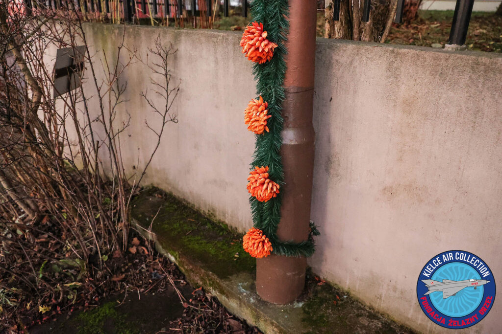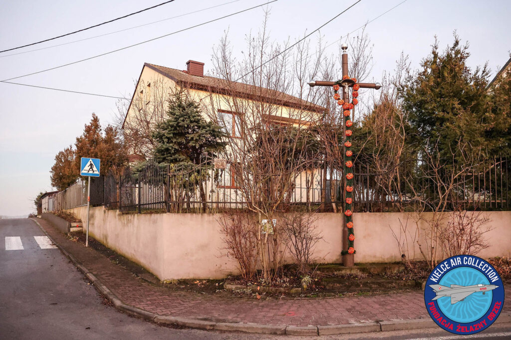 Drugi krzyż znajdziemy przy skrzyżowaniu ulic Szkolnej, Spacerowej i Glinianej. Główną część stanowi lufa pochodząca z rozbitego czołgu T34 kaliber 85 mm, wraz z jarzmem. Zwieńczenie krzyża wykonano z pocisku przeciwpancernego od takiego czołgu. W ramionach znajdują się skorupy po pociskach od moździerza. Na początku wokół krzyża stały pociski artyleryjskie dużego kalibru, jednak stanowiły niebezpieczną ozdobę, i zostały zabrane przez saperów. Na postumencie umieszczono tablicę z napisem:
