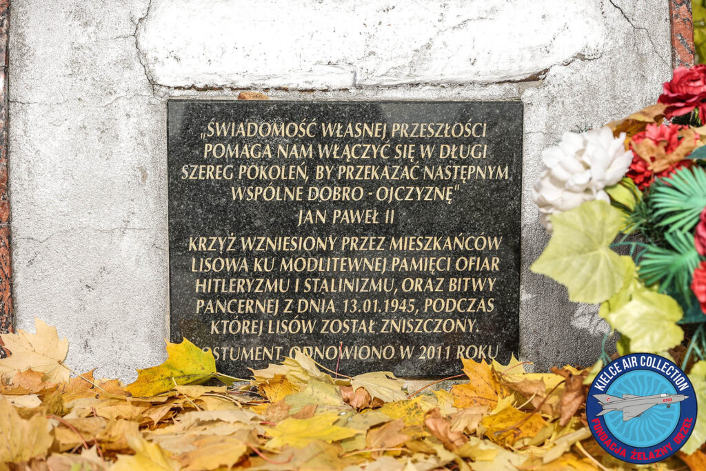 Krzyż wzniesiony przez mieszkańców Lisowa ku modlitewnej pamięci ofiar hitleryzmu i stalinizmu, oraz bitwy pancernej z dnia 13.01.1945, podczas której Lisów został zniszczony.