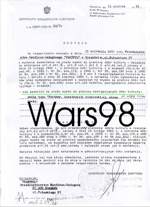 W internecie gorzeją dyskusje, czy to dobrze czy to źle, że wrak Pz.Kampf.V Ausf. A Panther wydobyty w 1990 roku opuścił Polskę. Ci którzy uważają, że to dobrze, jako argument podają to, że czołg obecnie jest kompleksowo wyremontowany, co pewnie nie udałoby się w naszym kraju, bo pozostające w Polsce podobne pojazdy często rdzewieją pod chmurką (jak np. wanna podobnego pojazdu wydobytego w 2003 roku, która obecnie znajduje się w Muzeum Orła Białego). I dopuszczam, że jest to prawdopodobny scenariusz, choć należy pamiętać, że obecnie są już w Polsce placówki, które mają duże sukcesy w remontowaniu takich pojazdów. Niezaprzeczalnym jest jednak fakt, że pojazd opuścił Polskę ze złamaniem obowiązującego prawa, w dodatku kiedy to się działo znana była decyzja generalnego konserwatora zabytków, który nie zgodził się na wywiezienie czołgu, gdyż „Stanowiłoby to uszczerbek dla kultury narodowej”. Więc wywiezienie odbyło się z premedytacją i pełną świadomością, że łamane jest prawo. Dlatego, i prezentuję tu swoje zdanie uważam, że mimo iż „Pantera” mogłaby w Polsce nie wyglądać tak efektownie jak po remoncie w USA, to jednak nastąpiło złamanie prawa, a tego zaakceptować nie można.