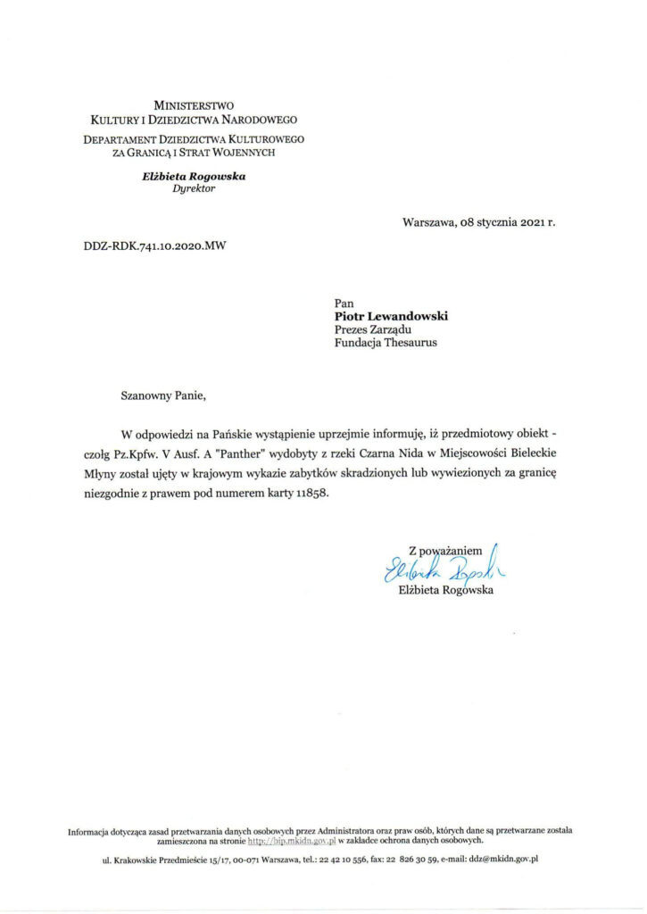 Kwestię czołgu od lat usiłuje wyjaśnić Piotr Lewandowski, prawnik i miłośnik militariów. W 2021 roku Fundacja Thesaurus (której Lewandowski jest prezesem) poinformowała, że „dzięki wieloletnim staraniom czołg Pz.Kpfw. V Ausf. A „Panther” nielegalnie wydobyty 16.11.1990 r. przez braci Kęszyckich z rzeki Czarna Nida w Bieleckich Młynach koło Morawicy pod Kielcami, i następnie bezprawnie wywieziony za granicę (ostatecznie do USA), wreszcie trafił do Krajowego wykazu zabytków skradzionych lub wywiezionych za granicę niezgodnie z prawem prowadzonego przez Ministra Kultury i Dziedzictwa Narodowego, w którym to wykazie został zapisany pod numerem: 11858.”