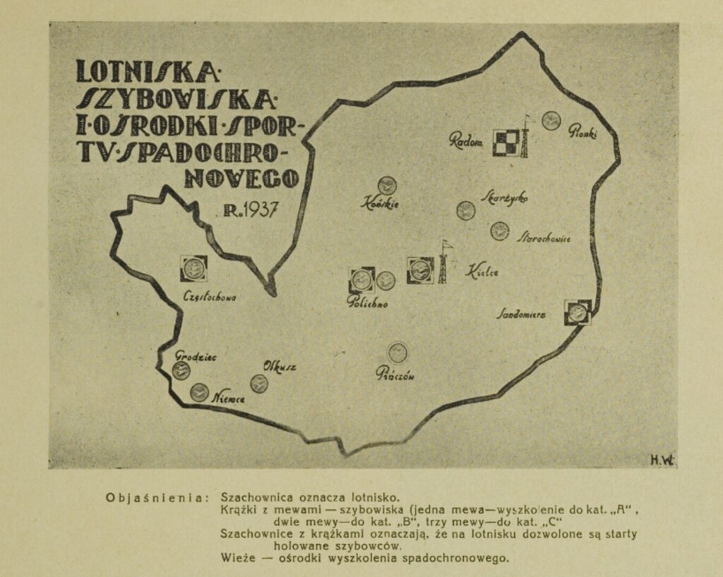 Na mapce z 1937 roku przedstawiającej lotniska, szybowiska i ośrodki szkolenia spadochronowego Suchedniów nie jest oznaczony, ale to nie powinno dziwić, wszak mapa powstała rok przed jego otwarciem.