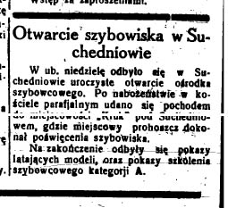 O tym miejscu powiedział mi Janusz Kędracki, który szukając informacji o Piłsudskim w archiwalnej Gazecie Kieleckiej z 1938, R.69, nr 75, znalazł wzmiankę o otwarciu suchedniowskiego szybowiska. Wiemy więc, że byłó – bo donosiły o tym gazety, rozpoczęło działalność w 1938 roku, na chwilę przed rozpoczęciem działań wojennych, które zapewne przyniosły kres lotniczym tradycjom Suchedniowa, zanim się jeszcze zdążyły narodzić.