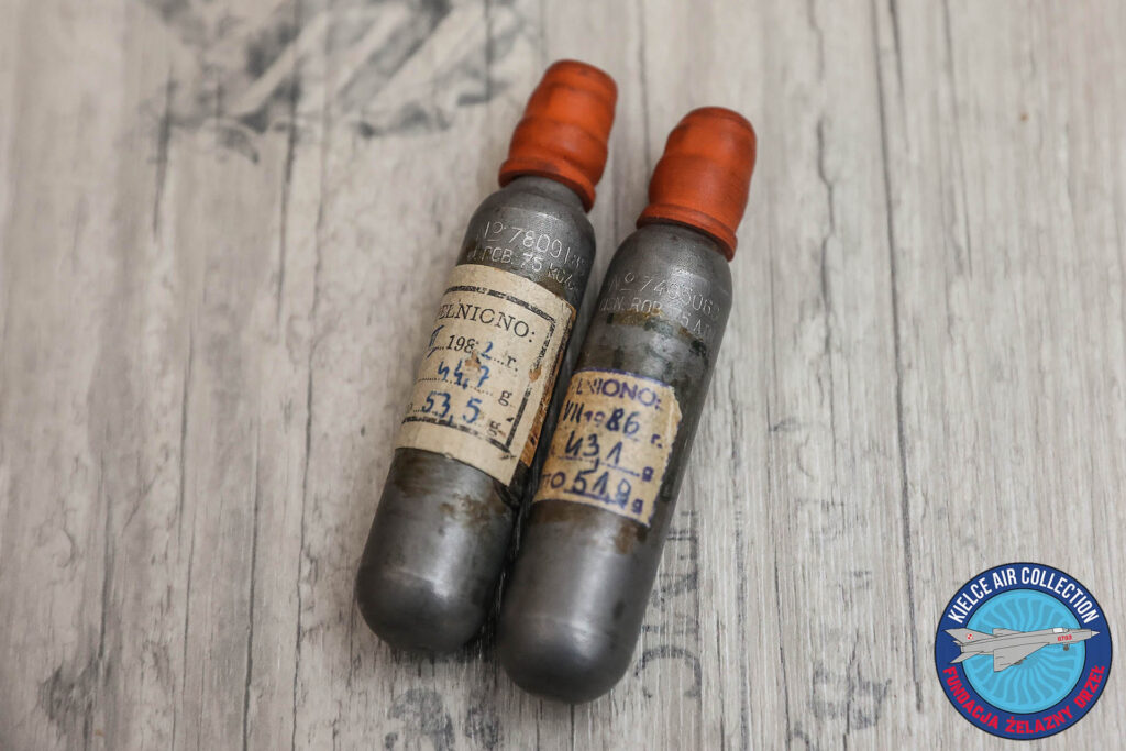 Dwie nieużywane butle (naboje) CO2 będące elementem systemu napełniania kamizelek KR-7 (zestaw na jedną kamizelkę).