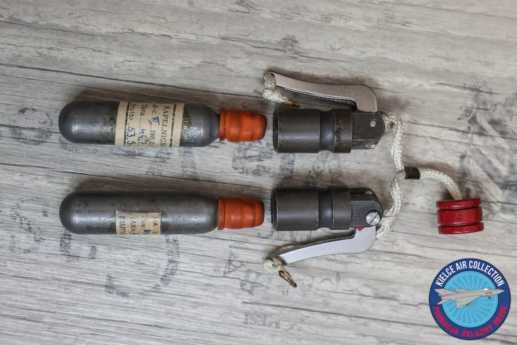 By napełnić kamizelkę, należało szarpnąć za czerwony uchwyt, co powodowało odchylenie ramienia i uwolnienie iglicy w mechanizmie, przebijającej zabezpieczenie wkręconego naboju i uwolnienie sprężonego gazu. Mechanizmy widoczne na poniższej fotografii (po prawej) posiadają dodatkowe zabezpieczenie w postaci małej zawleczki, która ma uchronić przed przypadkowym zwolnieniem iglicy. Mechanizmy jak widać na zdjęciu występują parami, połączone jednym sznurkiem. Zasadą w lotnictwie jest stosowanie w kluczowych miejscach od 2 do nawet 4 praktycznie niezależnych instalacji, tak jest i tu. W przypadku wadliwości jednego naboju lub/i mechanizmu drugi powinien zadziałać.