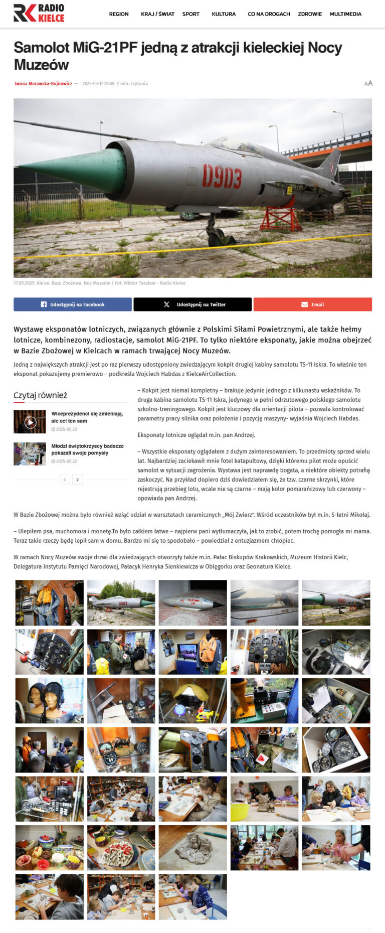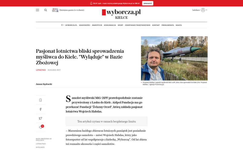 Jeśli ktoś ma prenumeratę cyfrową Wyborczej, to pod TYM linkiem znajduje się tekst Janusza Kędrackiego z 23 maja 2023 roku pt. „Pasjonat lotnictwa bliski sprowadzenia myśliwca do Kielc. „Wyląduje” w Bazie Zbożowej”.