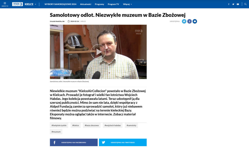 „Samolotowy odlot. Niezwykłe muzeum w Bazie Zbożowej”, to z kolei materiał który ukazał się na antenie TVP3 Kielce, choć z dobrze poinformowanych źródeł wiem, że był też w telewizji ogólnopolskiej.