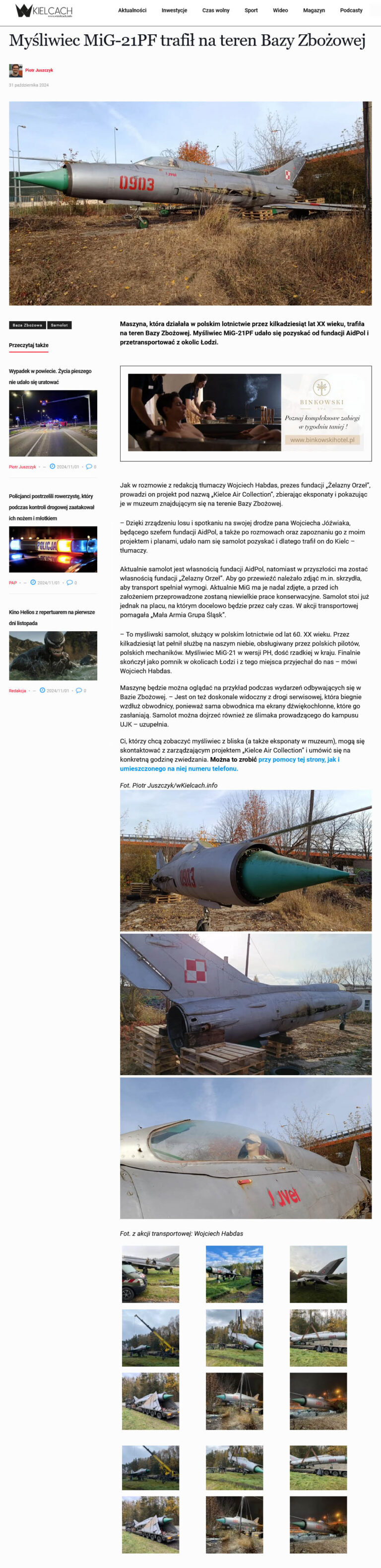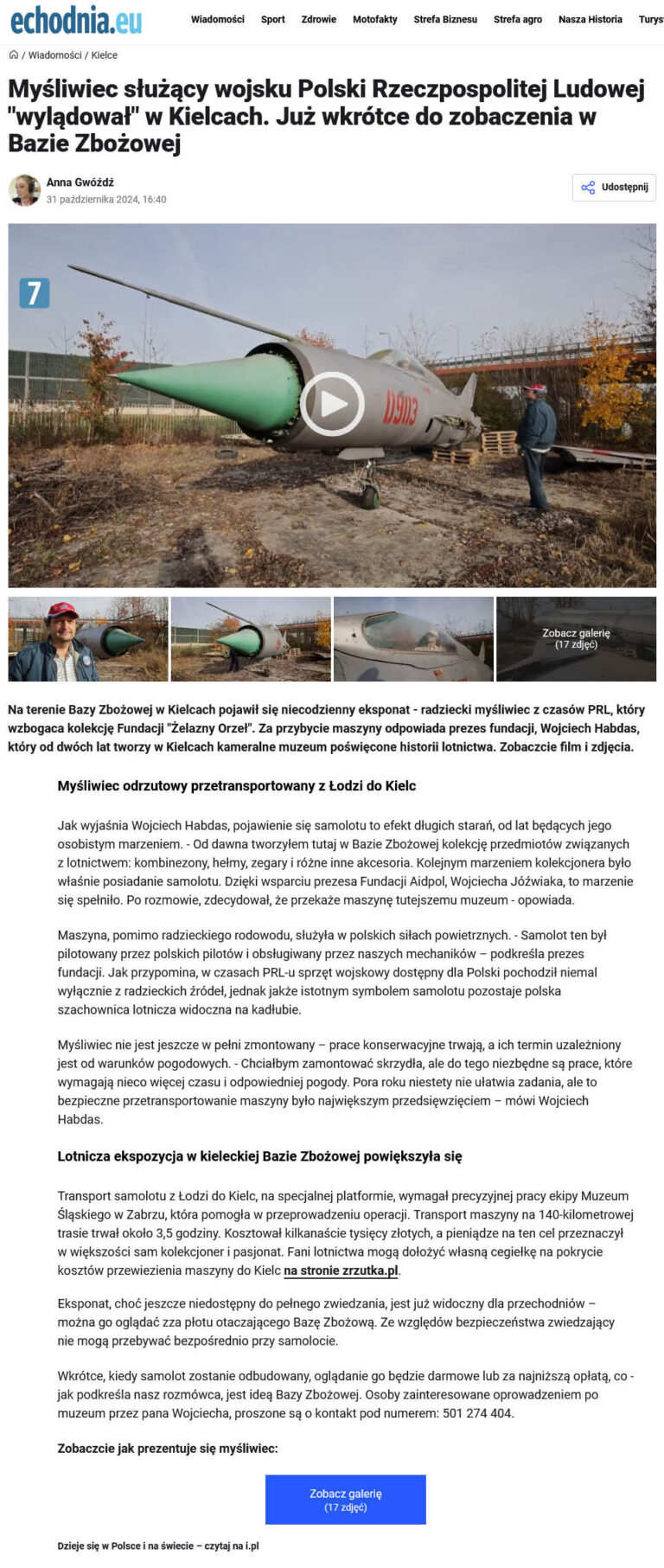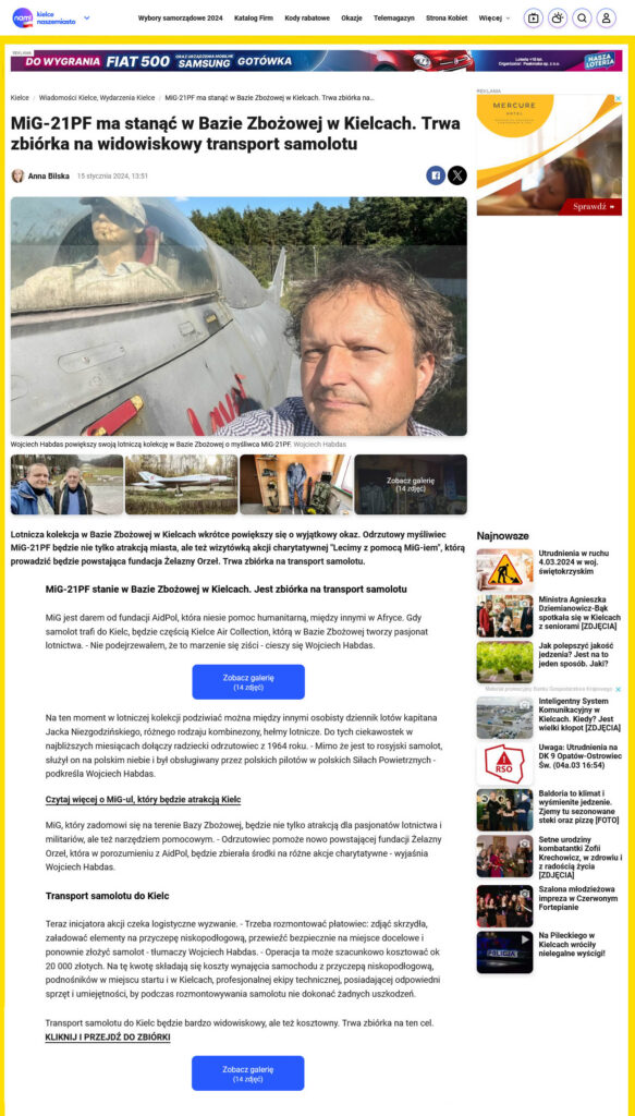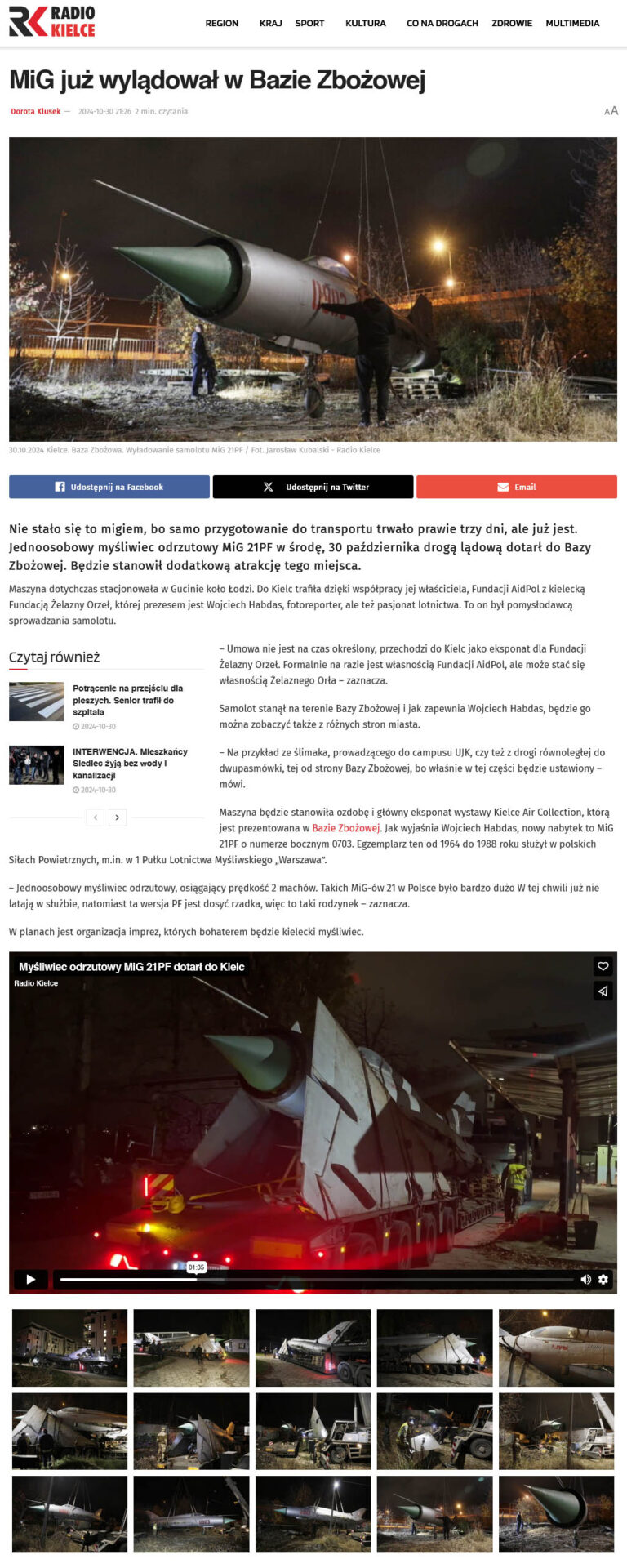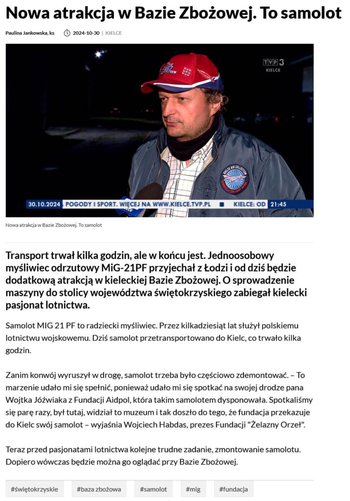 Przyjazd do Kielc myśliwca MiG-21PF od Aidpol Fundacji odnotowali także dziennikarze z portalu wKielcach.info w materiale „Myśliwiec MiG-21PF trafił na teren Bazy Zbożowej„.