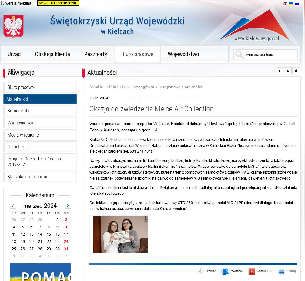 Świętokrzyski Urząd Wojewódzki, z okazji przygotowań do licytacji WOŚP, na swojej stronie WWW informował: Okazja do zwiedzenia Kielce Air Collection