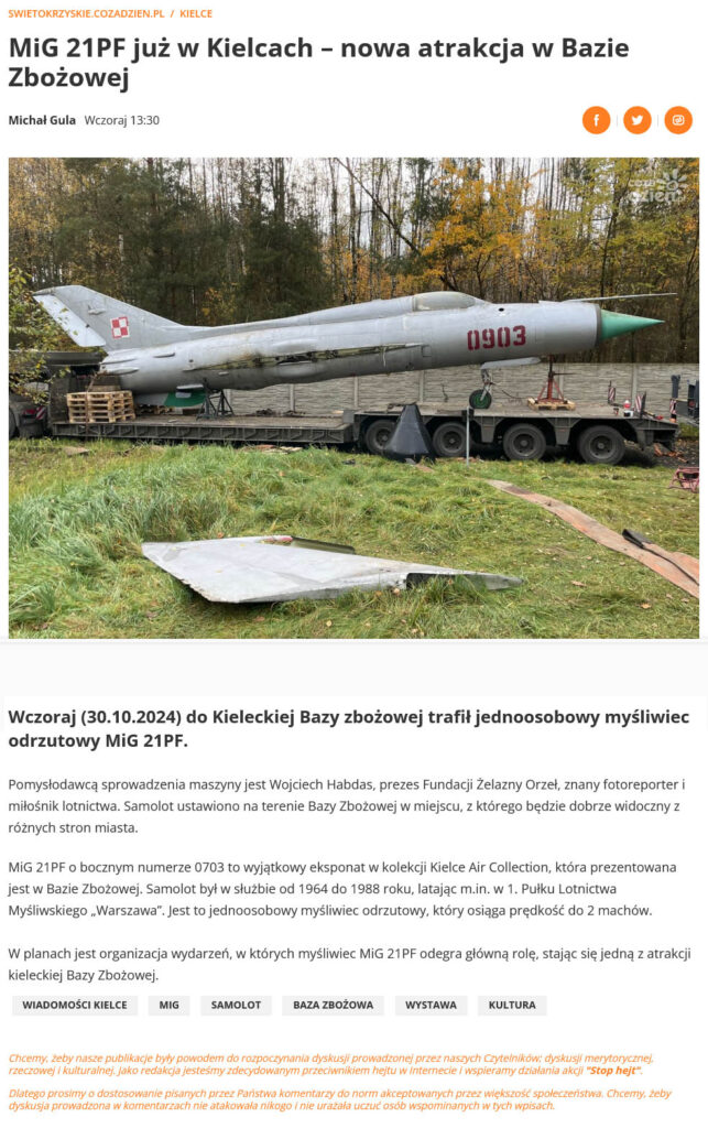 Na portalu https://kielce.naszemiasto.pl ukazał się artykuł „MiG-21PF ma stanąć w Bazie Zbożowej w Kielcach. Trwa zbiórka na widowiskowy transport samolotu”.