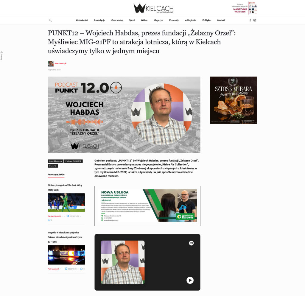 10 grudnia 2024 r. na portalu wKielcach.info ukazał się kolejny odcinek podcastu „PUNKT12” w którym miałem możliwość opowiedzieć o projekcie „Kielce Air Collection”, zgromadzonych w Bazie Zbożowej eksponatach związanych z lotnictwem, w tym o myśliwcu MiG-21PF od Fundacji Aidpol.