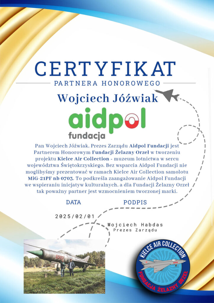 Pierwszy kontakt z AIDPOL FUNDACJĄ to wiadomość wysłana poprzez fb, z zapytaniem o samolot o którym Aidpol Fundacja wspomniała na swoim profilu. Po kilku tygodniach była druga wiadomość, i dosyć szybko przeszliśmy do kontaktów telefonicznych a następnie spotkań. I tak z nieznajomych zostaliśmy z panem Wojtkiem Jóźwiakiem, prezesem Fundacji przyjaciółmi. Cieszę się niezmiernie, że udało mi się swoimi działaniami sprawić, że Pan Wojtek – mój imiennik – zaufał mi i dostrzegł potencjał w moich działaniach. Dzięki temu AIDPOL FUNDACJA wsparła Kielce Air Collection umożliwiając prezentację samolotu MiG-21PF w Bazie Zbożowej w Kielcach.